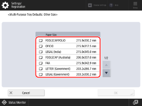 For the sizes of paper that are displayed when [Other Size] is pressed, see the following: