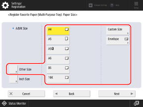 For the sizes of paper that are displayed when [Other Size] is pressed, see the following: