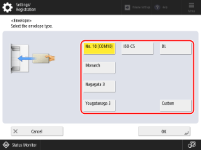 When you press [Custom], [Next] appears. Press [Next], enter the envelope size including the flap length of the loaded envelopes (length of side), and then press [OK].