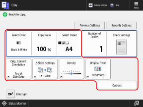 The copy screen is displayed when you press [Copy] on the [Home] screen of the control panel.