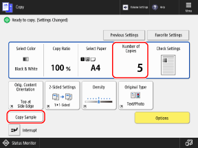 Placing OriginalsOn the copy screen, enter the number of copies, and press [Copy Sample].