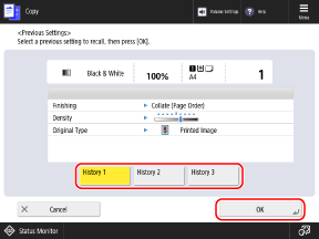 On the [Previous Settings] screen, select the history you want to recall, and press [OK].