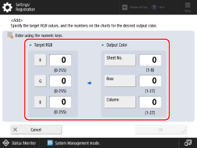 Refer to the chart printed in Step 1, and enter numbers in [Sheet No.], [Row], and [Column] for the colors you want to reproduce.