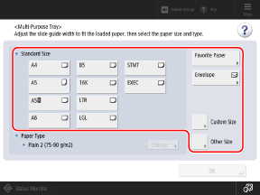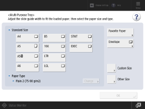 When paper is loaded in the multi-purpose tray, the following screen is displayed on the control panel. Set the paper size and type according to the loaded paper.