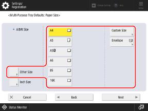 For the sizes of paper that are displayed when [Other Size] is pressed, see the following: