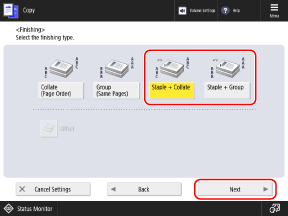 Select [Staple + Collate] or [Staple + Group], and press [Next].