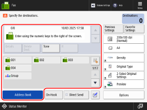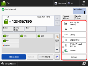 You can press [Previous Settings] to call up the settings used to send faxes in the past. The sending destination is also applied together with the settings that are called up.