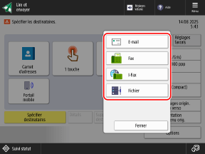 Selon les réglages de la machine, il est aussi possible de spécifier des destinataires de type fax dans l'écran de numérisation.
