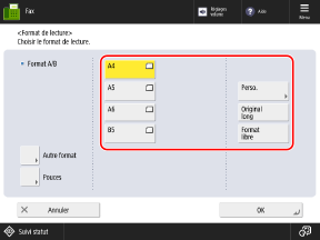 Suivez la procédure ci-dessous pour enregistrer les formats lorsque vous utilisez fréquemment des originaux de format non standard. Vous pouvez appeler le format sur l'écran de saisie du format, ce qui vous évite de saisir le format à chaque fois.