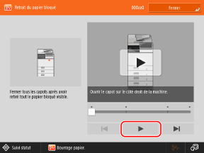 * L’écran s’affiche à plusieurs reprises jusqu’à ce que le bourrage papier ou d’agrafes soit éliminé. Si vous appuyez sur [Fermer], il se peut que l’écran se ferme temporairement et que vous puissiez effectuer une autre opération ou un autre réglage.