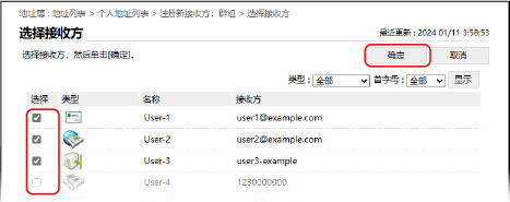 选中要注册到群组的接收方的复选框,然后单击 [确定]。