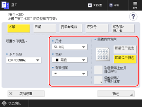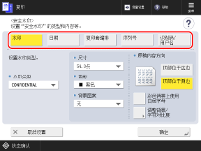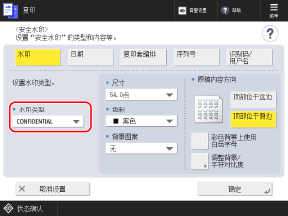 在 [安全水印] 屏幕上配置的设置会应用于样张打印件的字符格式。