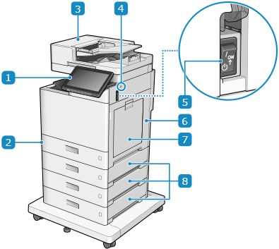 要详细了解安装可选配件时的机器配置和可选设备单元的部件名称,请参阅以下内容。