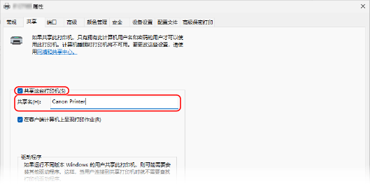 在 [正在共享] 选项卡上,选中 [共享这台打印机] 复选框,然后输入共享名称。
