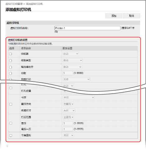 可以将常用的打印设置(例如纸张类型和双面打印)注册为虚拟打印机。然后,可以通过执行相关命令,指定适合文档的虚拟打印机作为参数,进而执行 LPD 打印或 FTP 打印。