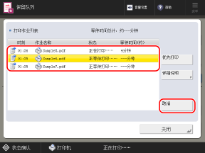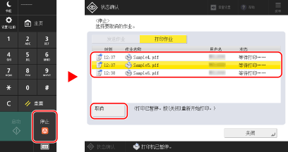 如果以上屏幕均未显示,请按 [ 停止],然后从打印作业列表中选择要取消的作业,再按 [取消]。