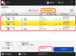 如果显示打印屏幕,请按 [已打印的作业],然后从打印作业列表中选择要取消的作业,再按 [取消打印]。