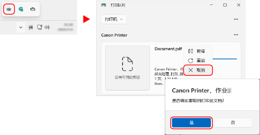如未显示上述屏幕,请双击 Windows 通知区域中的打印机图标,选择要取消的文档,然后右键单击 [取消] 单击 [是]。