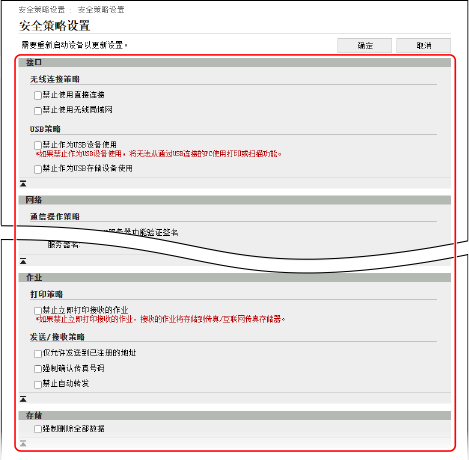 配置安全策略后,控制面板和远程用户界面的 [设置/注册] 屏幕上将显示限制功能和操作的信息。