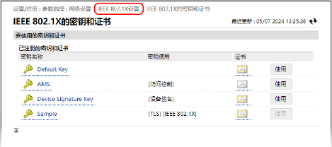 随即显示 [IEEE 802.1X的密钥和证书] 屏幕。