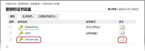 [密钥和证书设置]屏幕的密钥和证书列表中显示的证书图标从 [] 变为 []。