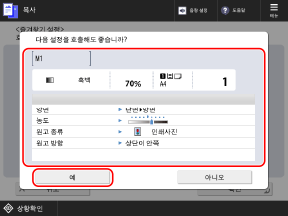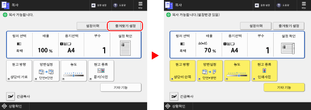 기능 화면에서 등록된 설정을 호출하여 기능을 바로 실행할 수 있습니다. 또한 필요에 따라 설정을 호출한 후에 변경할 수 있습니다.