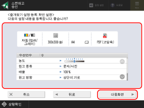 스캔 및 팩스 설정을 등록할 때, 등록할 세부 정보를 설정하는 동안 대상을 지정한 경우, 대상도 즐겨찾기 설정에 등록됩니다. 불필요한 대상이 지정되지 않았는지 확인하면서 설정을 등록합니다.