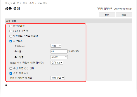 [수신정보 기록을 인쇄함] 확인란을 선택합니다. 수신 일시와 페이지 번호 같은 정보는 페이지 하단에 인쇄됩니다.