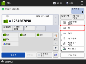 팩스 화면에서 원고 크기 설정 버튼을 누릅니다.