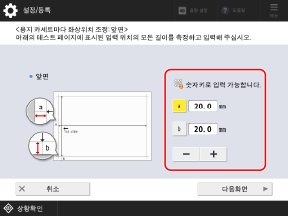 화면 지시에 따라 테스트 페이지 앞면과 뒷면에서 각 길이를 측정하고 값을 입력합니다.