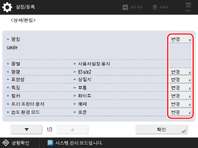 용지 종류 정보를 변경할 각 항목에 대해 [변경]을 누를 수 있습니다.