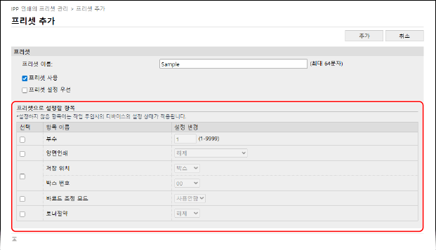 등록한 프리셋이 [IPP 인쇄의 프리셋 관리] 화면에 추가됩니다.