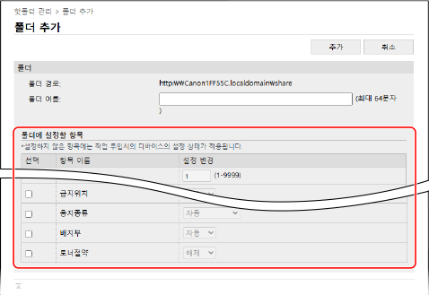 [폴더에 설정할 항목]에서 인쇄 설정을 구성합니다.