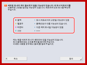 상황확인]을 누르고 [소모품./기타]에서 용지 설정을 확인합니다.