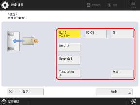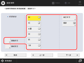 此外,您還可以將在多用途紙盤中裝入紙張時顯示的畫面,設定爲「常用紙張」的畫面,以便快速地設定紙張尺寸和類型。