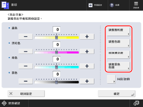 如果您經常使用特定色調的原稿,可以註冊已調整的色彩設定。這樣,您就可以在畫面上叫回這些設定來調整色彩平衡,從而省去每次都要調整色彩平衡的麻煩。
