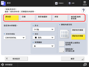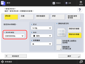 您可以在影印時嵌入不可見的背景文字 (安全浮水印),例如「TOP SECRET」或「CONFIDENTIAL」。