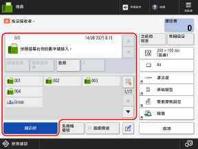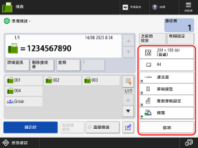 您可以按下 [之前的設定] 叫回之前傳送傳真時使用的設定。傳送接收者也會與叫回的設定一起套用。