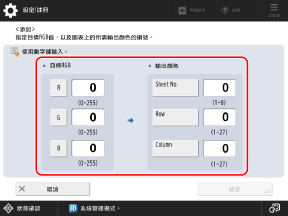 請參閱步驟 1 中列印的圖表,並對於要重現的色彩在 [Sheet No.]、[Row] 和 [Column] 中輸入色彩的數字。