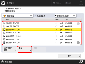 您可以影印本機中已註冊的其中一種紙張類型,變更名稱和紙張資訊,並且註冊為新的紙張類型(自訂類型)。