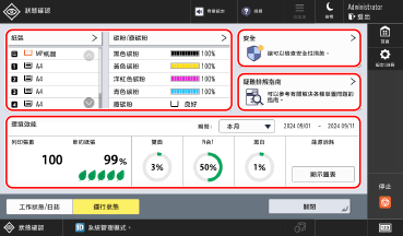 您可以顯示一個畫面同時檢查多個項目的狀態,例如紙張和碳粉的剩餘量、本機安全措施的狀態、排除傳真和列印過程中出現的問題所用的支援資訊,以及指定時間內的列印工作狀態和耗電量。