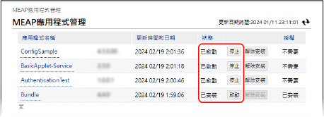 您可以開始和停止使用 MEAP 應用程式,以及解除安裝應用程式。您也可以設定應用程式的認證資訊。