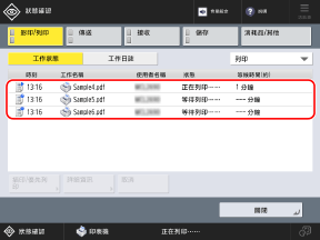 若按下 [優先列印],所選工作會置於等待佇列的最上方。所選工作會在前一個正在進行的工作完成後執行。