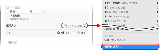 在 [紙張大小] 中,選擇 [管理自定大小]。