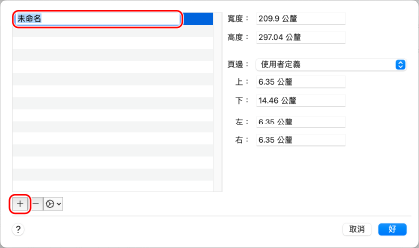 按一下左下角的 [+],再按一下 [未命名],然後輸入自訂尺寸紙張名稱。