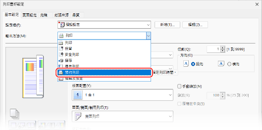 在 [輸出方法] 中,選擇 [預約列印]。