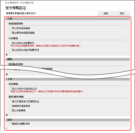 設定安全性策略時,控制台和遠端使用者介面的 [設定/註冊] 畫面會顯示訊息,指示功能和操作受到限制。