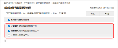 若要允許對未知部門識別碼進行黑白列印和影印,請勾選 [允許黑白影印/列印工作] 核取方塊。