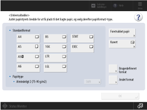 Når der er lagt papir i universalbakken, vises skærmen til indstilling af papiret som standard på betjeningspanelet. Indstil papirstørrelsen og -typen i overensstemmelse med det ilagte papir.
