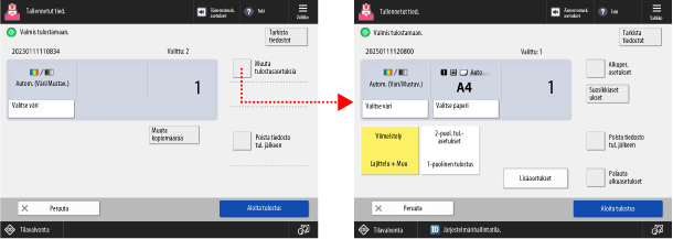 Voit määrittää seuraavat asetukset painamalla [Muuta tulostusasetuksia] näytön oikeassa yläkulmassa:
